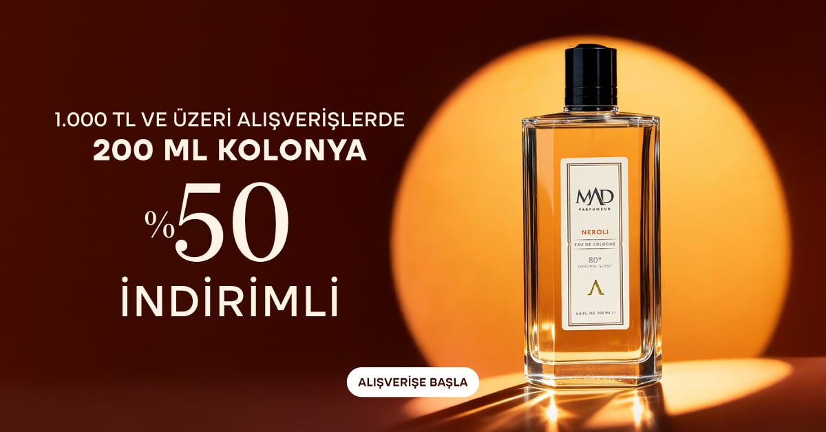 Kampanya stoklarla sınırlıdır. Kampanya yalnızca 1.000 TL ve üzeri alışverişlerde geçerlidir. Kampanya 06.10.2025 – 19.10.2025 tarihleri arasında geçerlidir. Kampanya kapsamında 1.000 TL ve üzeri alışveriş yapan müşteriler 200 ML Kolonyaları %50 indirimli olarak satın alabilirler. Mad Parfumeur, kampanya koşullarında değişiklik yapma hakkını saklı tutar.