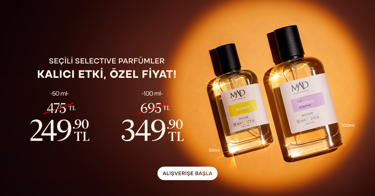 Kampanya stoklarla sınırlıdır. Kampanya yalnızca seçili Selective parfüm ürünlerinde geçerlidir. Kampanya 06.10.2025 - 23.11.2025 tarihleri arasında geçerlidir. Kampanya kapsamında 100 ml Selective parfümler 349,90 TL, 50 ml Selective parfümler 249,90 TL fiyatıyla sunulmaktadır. Bu kampanya diğer kampanyalarla birleştirilemez. Mad Parfumeur kampanya koşullarında değişiklik yapma hakkını saklı tutar.